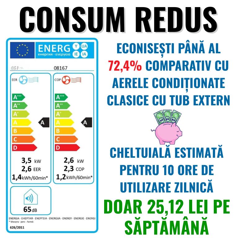 Motorul intern inovator, cu schimbător de căldură și rezervor de condens, reușește să reducă consumul și să aibă un impact pozitiv asupra facturii la energie electrică. Nu se va bloca niciodată din cauza soarelui sau a căldurii excesive de afară, astfel motorul nu va fi niciodată suprasolicitat, așa cum se întâmplă cu aparatele de aer condiționat tradiționale. Acest lucru reduce consumul de energie electrică cu peste 72,4%.