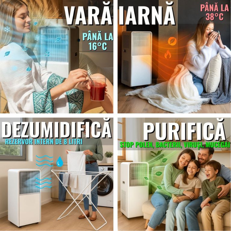 Răcește, încălzește și dezumidifică locuința ta tot timpul anului, purificând aerul de polen, viruși și bacterii cu aerul condiționat portabil 4 sezoane