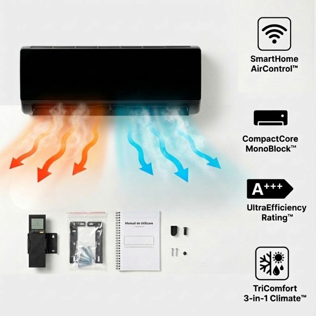 Ajunge deja asamblat: îl poziționezi, îl conectezi la priză și setezi temperatura. Fără tehnician, fără programări de așteptat.