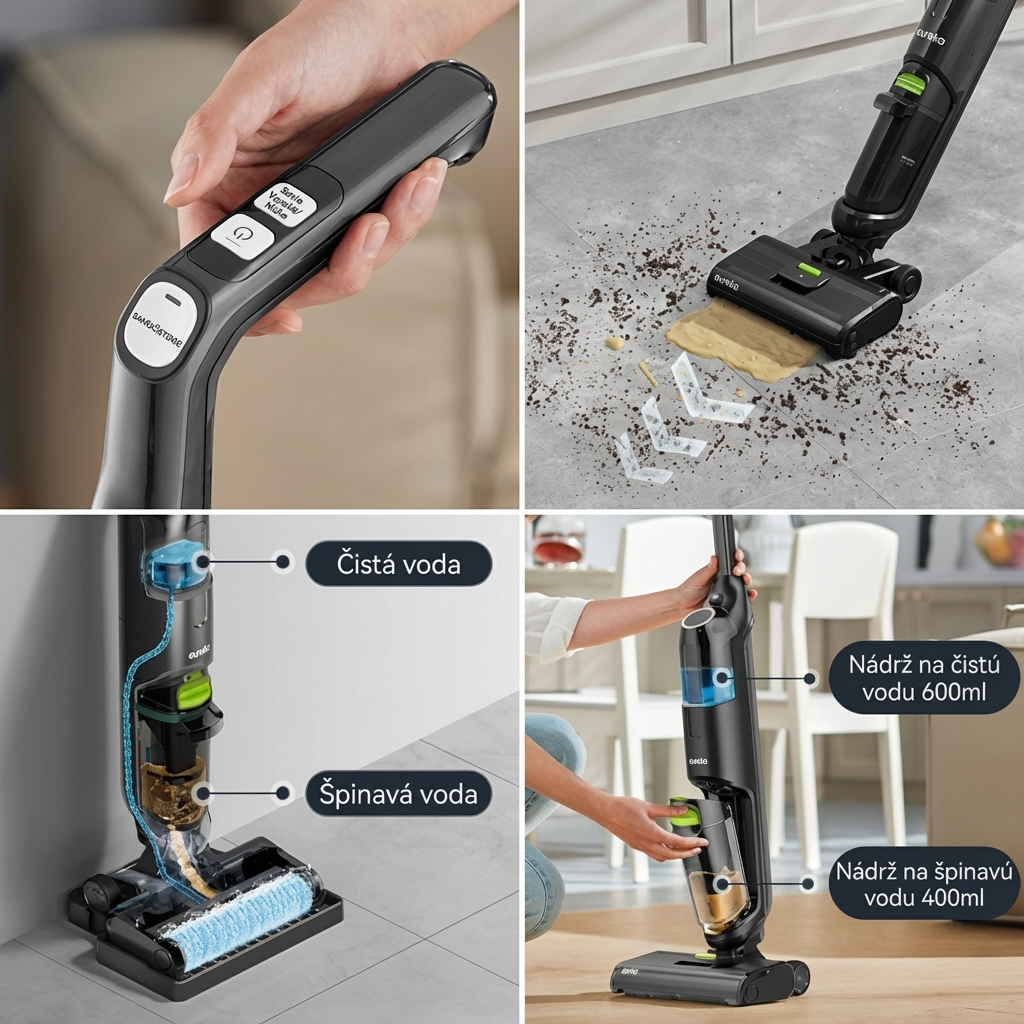 Stačí stlačiť tlačidlo ON a VYBRAŤ PROGRAM, KTORÝ CHCETE (vysávať, umývať, dezinfikovať, sušiť alebo všetko spolu) a automaticky sa vyčistí. Po dokončení programu stačí vyprázdniť nádobu na špinavú vodu.