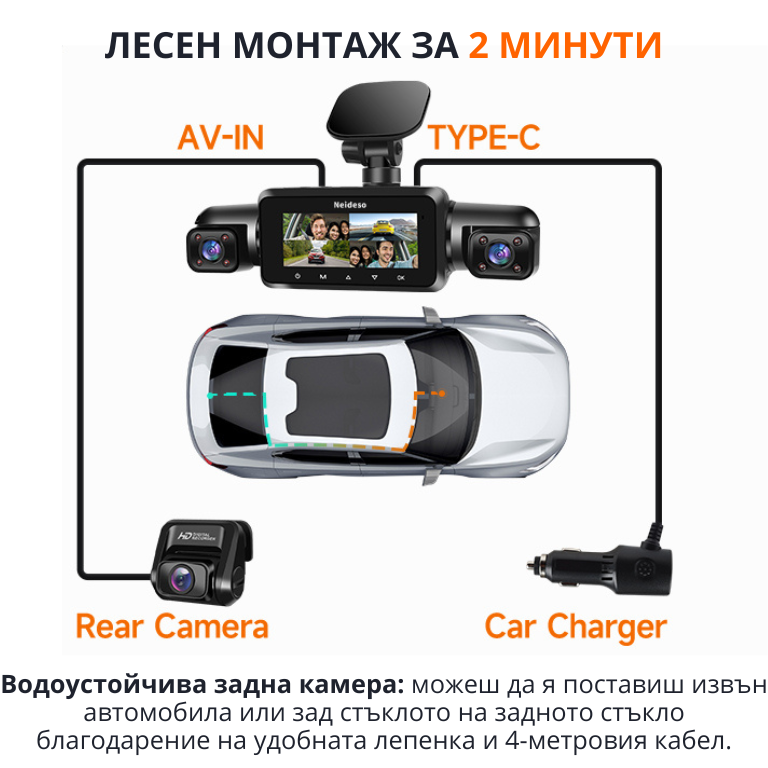Мощната батерия от 21 000 mAh осигурява до 72 часа непрекъснат запис, с бързо зареждане за само 25 минути чрез USB или запалка.