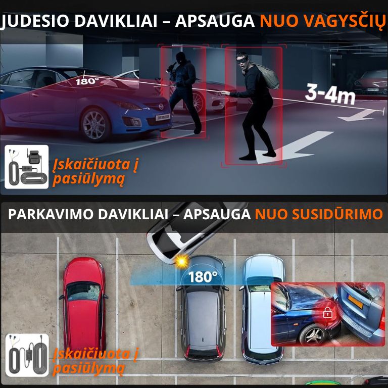 Dash kamera su išmaniais parkavimo jutikliais įrašo 4K kokybe net naktį ir aptikus judesį. Veikia iki 72 valandų stovėjimo režimu ir lengvai įdiegiama be mechaniko pagalbos.