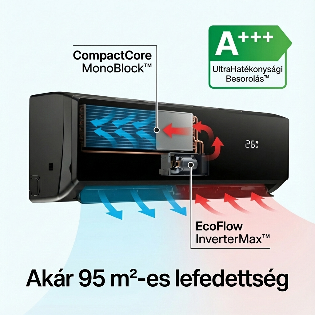 A klímaberendezés teljes szíve egyetlen kompakt belső egységbe van zárva, külső motorok, látható csövek vagy bonyolult telepítések nélkül. A CompactCore MonoBlock™ rendszer egyenletesen osztja el a meleg vagy hideg levegőt, míg az EcoFlow InverterMax™ technológia automatikusan szabályozza a teljesítményt a beállított hőmérséklet alapján.