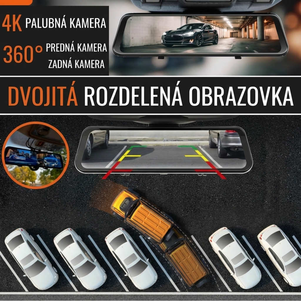 Satelitné spätné zrkadlo s 360° UHD 4K kamerami pre kompletné videozáznamy počas jazdy a parkovania, funkcie ADAS, GPS navigácia a radarový systém na detekciu rýchlostných radarov